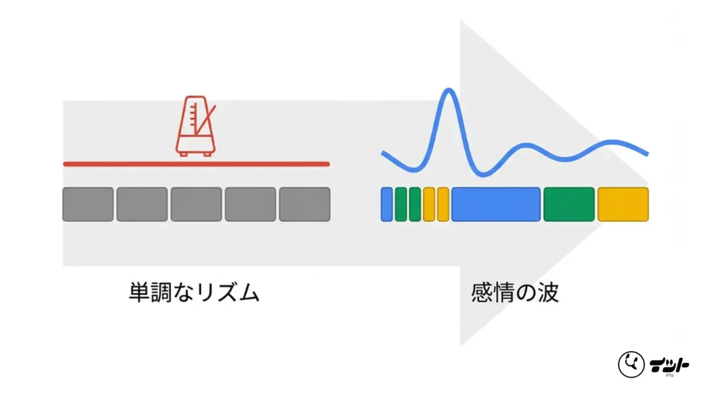 それを早めてしまうと「せわしない」と感じ、遅すぎると「間延びしている」と感じます。