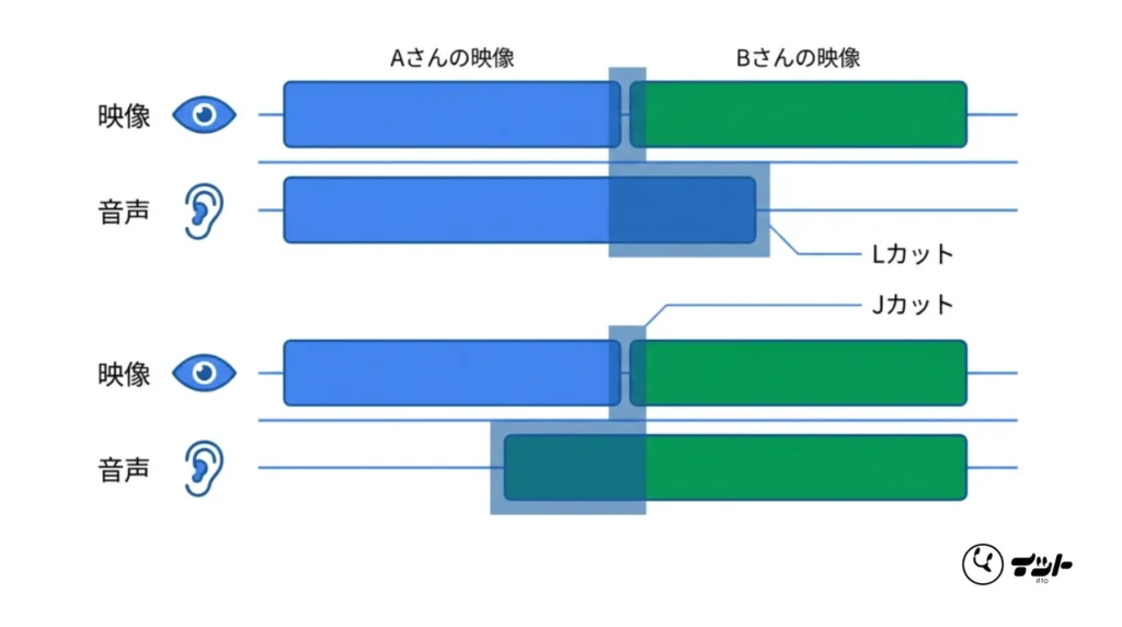 プロの編集では、音声と映像の切り替えタイミングをあえてズラす「Lカット」と「Jカット」を多用します。