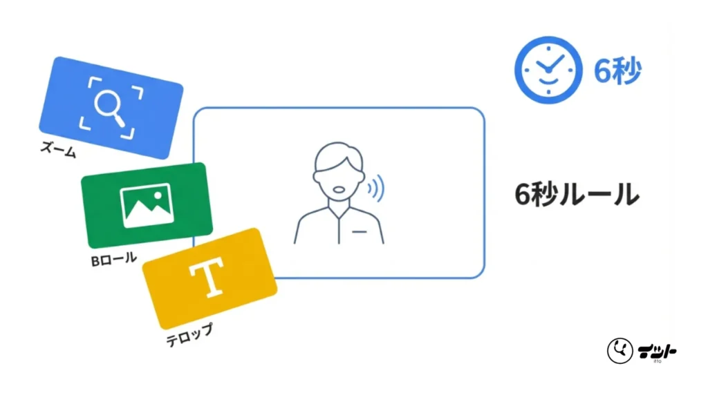 これは、どんなに長くても6秒に1回は画面に変化を起こすという鉄則です。カットを変えるのが難しい場合でも、以下のような「小技」を使って視覚的な情報を更新し続けることが重要です。